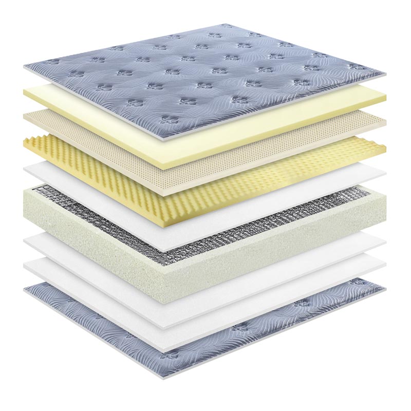 உயர் அடர்த்தி நுரை மற்றும் ஸ்பிரிங் ஹைப்ரிட் மெத்தை என்பது தொழில் ரீதியாக வடிவமைக்கப்பட்ட மெத்தை அமைப்பாகும். உயர் அடர்த்தி நுரை ஆறுதல் அடுக்குகள் கொண்ட எஃகு வசந்த ஆதரவு.
